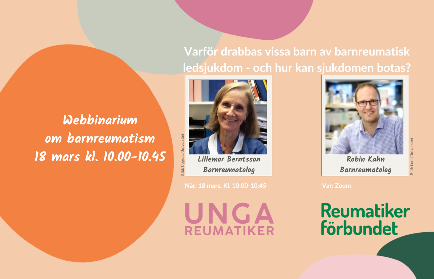 På Internationella Barnreumatikerdagen, den 18 mars, arrangerar Reumatikerförbundet tillsammans med Unga Reumatiker ett webbinarium om barnreumatisk ledsjukdom. Vår ordförande Camilla Blomberg inleder samtalet där barnreumatologerna Lillemor Berntsson och Robin Kahn berättar mer om barnreumatism och svarar på frågor.